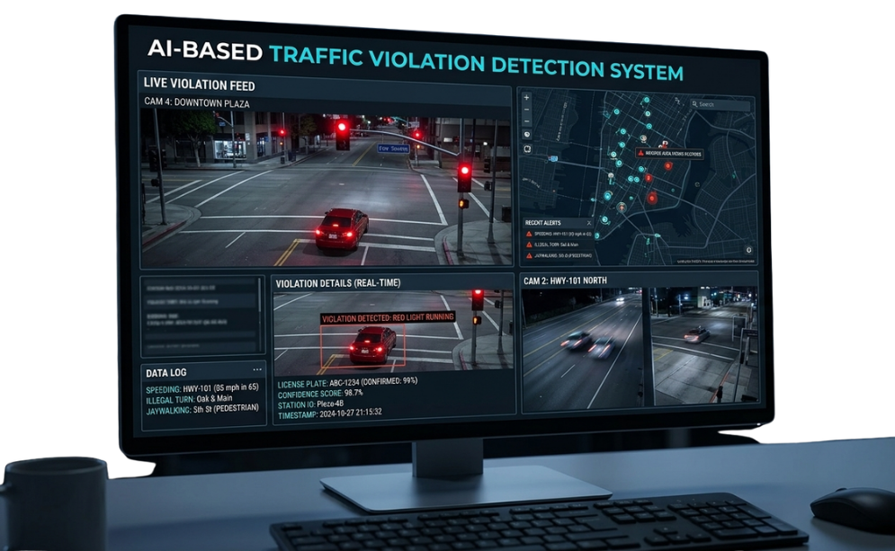 The AI-Based Traffic Violation Detection System is an automated enforcement solution that identifies and records traffic violations such as signal jumping, over-speeding, lane indiscipline, and helmet or seatbelt non-compliance. Powered by real-time video analytics and number plate recognition technology, the system ensures accurate violation capture with minimal manual intervention.