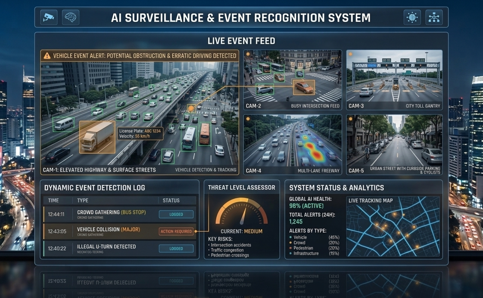 The AI Surveillance & Event Recognition System is a comprehensive video analytics platform designed to provide continuous, intelligent monitoring of urban environments. By combining edge-based AI processing at camera level with centralized analytics engines, the system ensures low-latency detection, high processing efficiency, and scalable deployment across cities. It goes beyond passive CCTV monitoring by transforming video feeds into structured, actionable intelligence for traffic authorities, municipal corporations, and command-and-control centers.