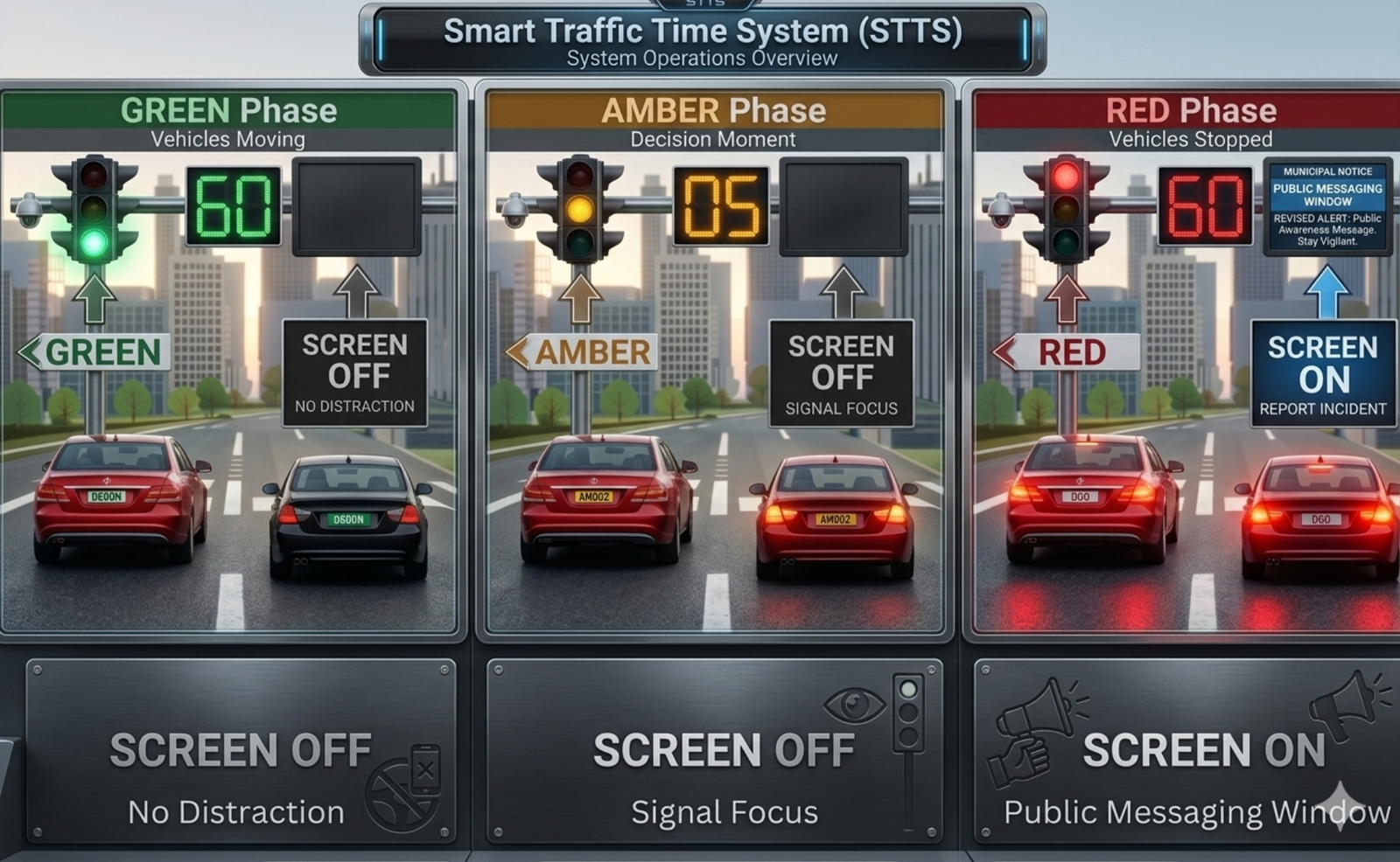 When the signal turns red, the STTS screen activates automatically and synchronizes with the red-phase countdown timer. This creates a controlled, predictable engagement window during which motorists and commuters are naturally attentive and stationary. As soon as the signal transitions back to green, the screen immediately turns OFF, preserving road discipline and ensuring zero interference with active traffic movement.